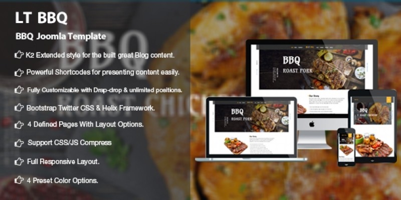 LT BBQ is a Responsive barbecue template which is nicely designed for diversity kinds of restaurant websites like barbecue restaurant, food center. The Barbecue website template is easy to use, stylish and will allow you to develop a specialized website without having to employ an expensive web designer. This template framework comes with Page Builder for layout, Shortcode for present content easily. Your chosen template comes with a personal panel full of widgets and modules you can use to fulfill your specific needs. Use the sortable gallery to showcase your menu and restaurant, or to advertise the items you sell. Choose from a range of style options including alternative module layouts, web web fonts, and adjustable color schemes, creating a web presence with individuality and seamless integration with your brand identity. In addition, it also supports 4 color styles and working with strong framework, unlimited module positions and easy to drag-drop layout content. The Barbecue website template is fully responsive and cross-browser compatible, allowing people to access your site from their chosen device and browser – your audience will never be limited by our CMS Templates.