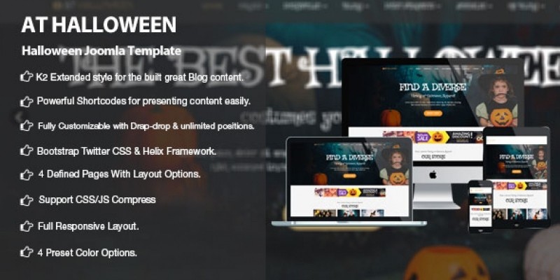 AT Halloween is Responsive CMS template that targets for halloween costume ideas or halloween store websites. Halloween website template builds from Bootstrap CSS Framework at the latest version, web Font and integrated with J2Store. The Blog module allow you to keep your viewers and clients engaged by discussing various topics related to this holiday. There is also a Contact Form module which can be very helpful in keeping an open relationship with your customers. People can address you questions using this form and you can offer reliable answers. Halloween Website template is 100% responsive so mobile device users can easily access it. It also comes with 4 color styles and boxed layout helping to create elegant websites with various layouts. AT Halloween is also good for anyone who wants to run an online Halloween store or a website that is oriented to the holiday season at hand.