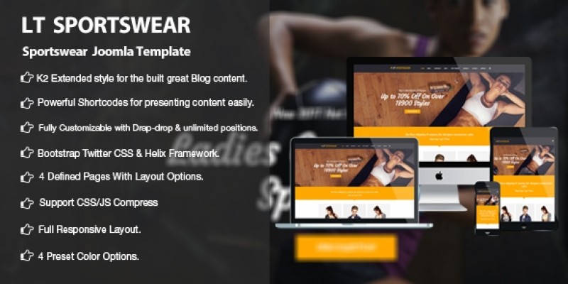 LT Sportswear is Responsive Sportswear CMS! template. The template framework comes with Page Builder for layout, Shortcode for present content easily, Support Font Awesome, Compress files, extended K2 style and support J2Store, so on. In addition, it also supports 4 color styles and working with strong framework, unlimited module positions and easy to drag-drop layout content. Couple that with the HTML plus JS animations running under a 3.7.3 CMS Engine and you’re sure to get a site with a very engaging design. It’s 100% responsive so that users can access your website from any device and browser they choose. As customers can use their smartphones with no depreciation of quality, you are afforded a website with mobility that is available when your customers need it, not just from a PC. Sportswear CMS! template designs with up to date features. There is a template to suit all tastes, and our templates are fully customizable Your theme can be tailored to suit your needs, resulting in a unique, modern and professional web presence. Selling online and increasing sales has never been so easy with a template from us.